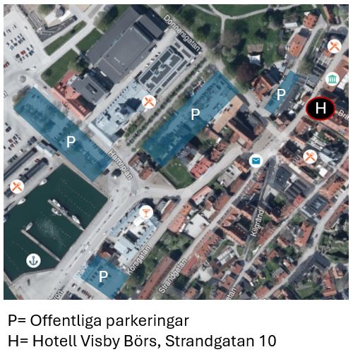 Varmt välkommen till oss på Hotell Visby Börs. Om du anländer med bil går det bra att först köra till oss för att lämna väskor. Det finns gott om offentliga parkeringar i närheten av hotellet, de finns utmärkta på kartan här till vänster. Vi rekommenderar att du använder appen Parkster som finns för på Iphone och Android.